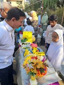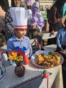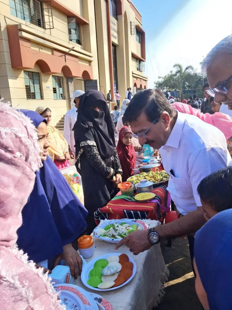 Institution President Mr. Jaffer Gilani is keenly observing the beautifuly decorated food displayed at the “Anand Mela”.